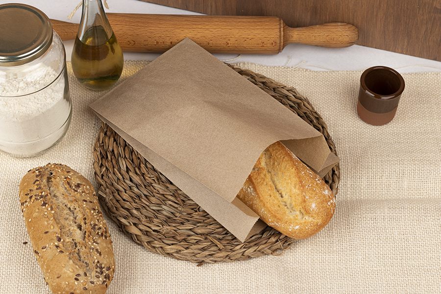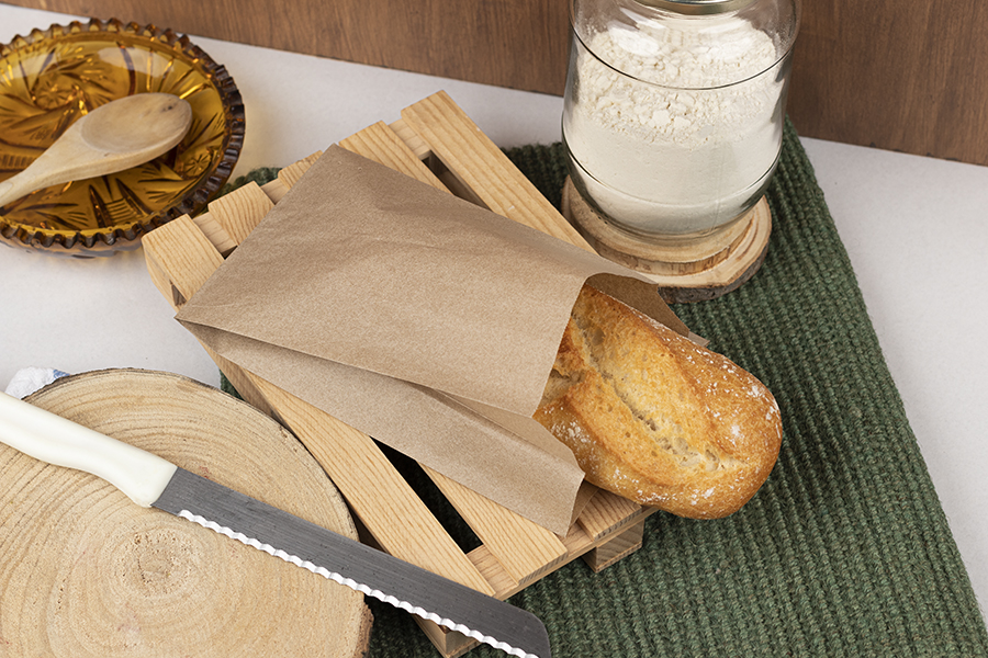 Bolsa para pan fabricada con papel Kraft marrón de 48 gr. Especialmente diseñada para panadería, consiguiendo así una presentación más estética e higiénica del producto.