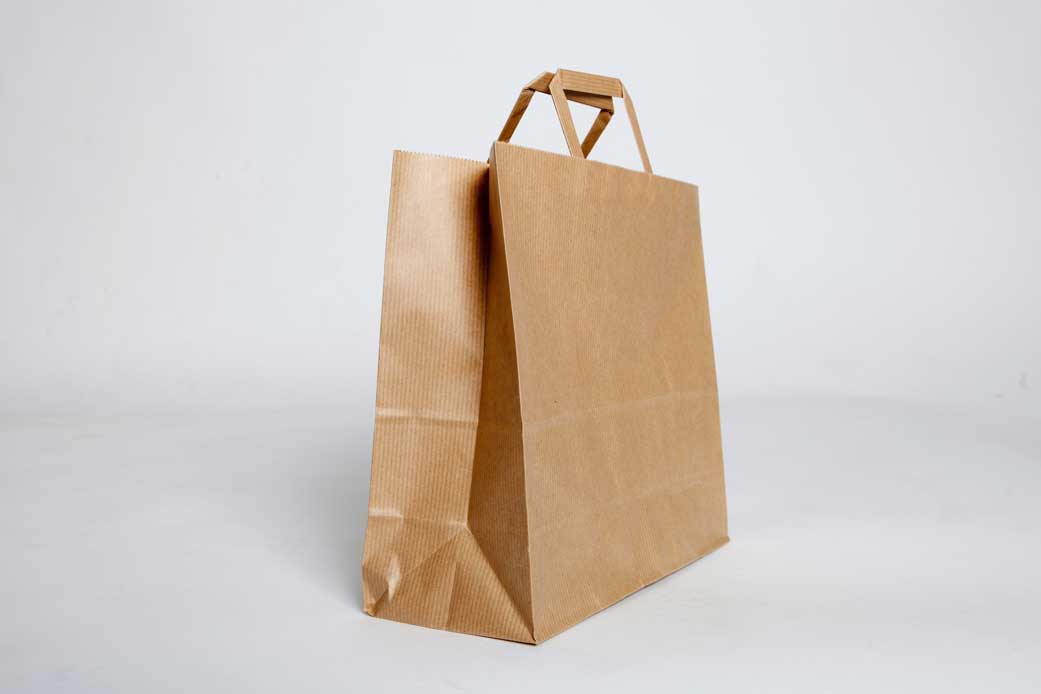 Bolsa de papel con asa plana especial Take Away por su fondo plano, ideal para contenedores de comida rectangulares. Gran resistencia al peso.
