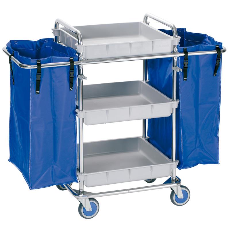 Carro cromado, 3 bandejas de polipropileno gris. 2 bolsas plastificadas, asas telescópicas, ruedas de 125 mm Ø. Capacidad bolsa: 77 l/ud.