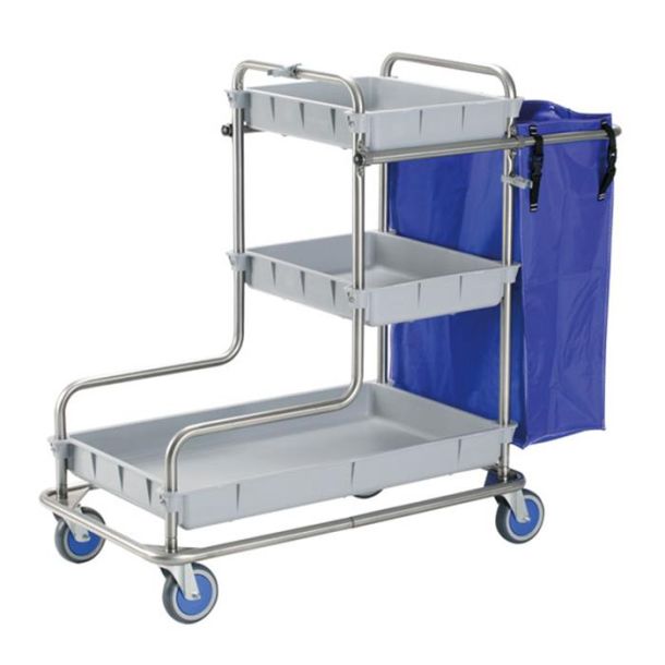 Carro de acero inox. 18/8 con 3 bandejas de polipropileno. 1 Asa telescópica, 1 bolsa de lona plastificada con 5 broches de 77 L.