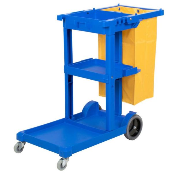 Carro de limpieza en HDPE con bolsa de lona amarilla. 2 ruedas traseras fijas (19,5 cm Ø) y 2 delanteras giratorias (7,5 cm Ø). 3 bandejas.