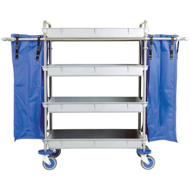 Carro cromado, 4 bandejas de polipropileno gris. 2 bolsas plastificadas, asas telescópicas, ruedas de 125 mm Ø. Capacidad bolsa: 144 l/ud.