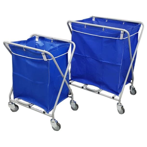 Carro plegable, chasis acero pintado epoxi antibac, 1 bolsa plastificada azul de 135 L con 6 ojales y 1 cuerda para cierre, ruedas giratorias de 100 mm Ø.